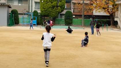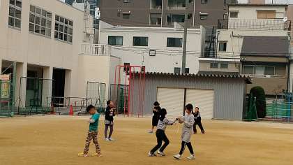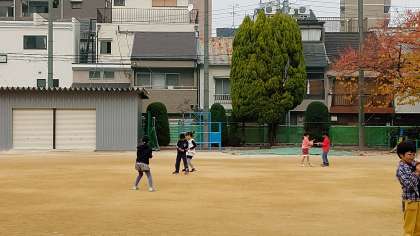 4時間目、2年生が、紙飛行機をゴムで引っ張って、運動場で飛ばしていました。空高く飛んでいました。
