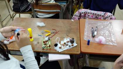 6時間目、4年生が図工の学習をしていました。木やボタン、松ぼっくり、ドングリ、綿などを使って 、自分の好きな物を作っていました。