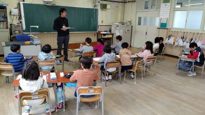 5時間目、1年生が、リズム運動のアンケートを書いていました。