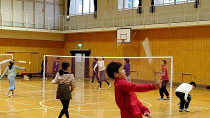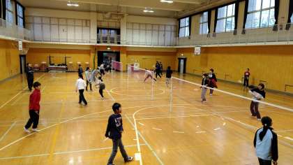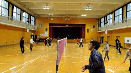 1時間目、6年生が講堂でバドミントンをしていました。
