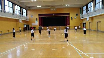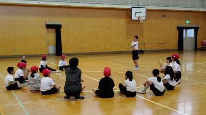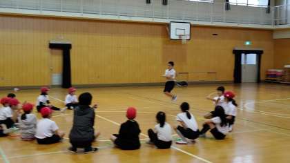 5時間目、2年生が講堂で体育の学習をしていました。「なわとび」の交差とびを続けるためには、どうすればよいか考えていました。