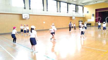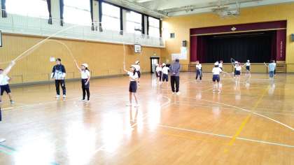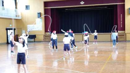 3時間目、4年生が講堂で体育の学習をしていました。「大縄くぐり」をしていました。縄にあたらないように、くぐるのが難しそうでした。