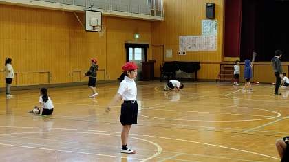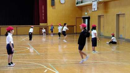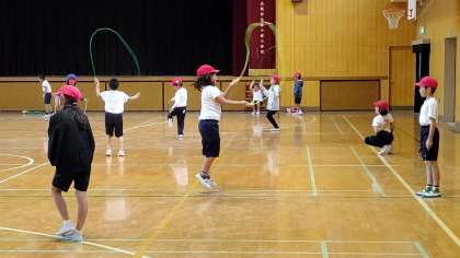 1時間目、2年生が講堂で体育の学習をしていました。「縄跳び」をしていました。