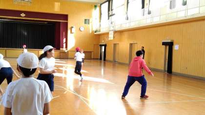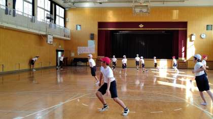 2時間目、6年生が講堂で体育の学習をしていました。準備運動のあと、「縄跳び」を練習していました。