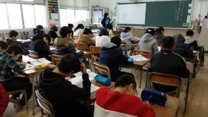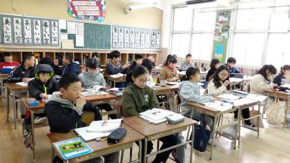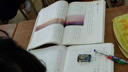 1時間目、5年生が国語の学習をしていました。「古文に親しもう」の単元を学習していました。清少納言の「枕草子」を学習したあと、自分で文章を考えていました。