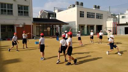 4時間目、5年生が運動場で体育の学習をしていました。長距離走のあと、大縄跳びをしていました。