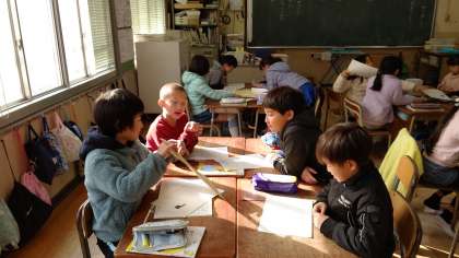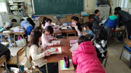 5時間目、3年生が国語の学習をしていました。昔の「わらい話」について、班ごとに音読発表する準備をしていました。