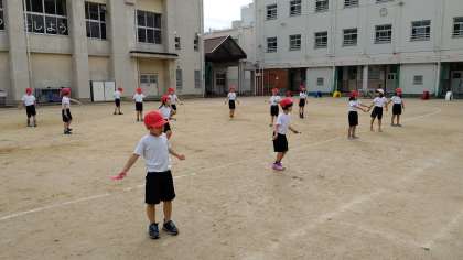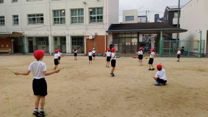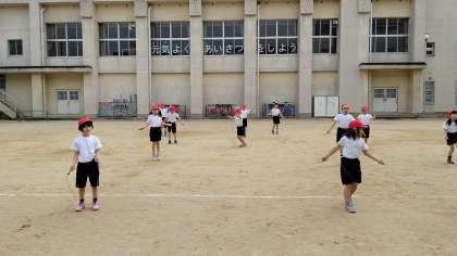 2時間目、1年生が運動場で体育の学習をしていました。「縄跳び」をしていました。