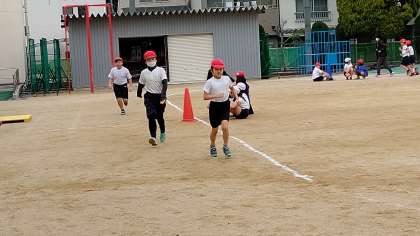 5時間目、4年生が運動場で体育をしていました。「長距離走」をしていました。