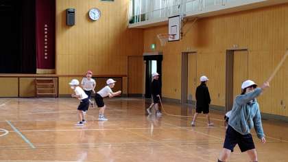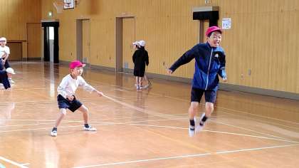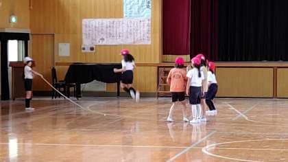 2時間目、3年生が講堂で体育の学習をしていました。「大縄跳び」をしていました。