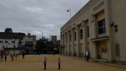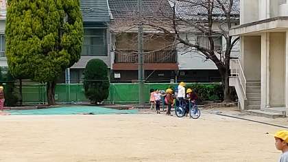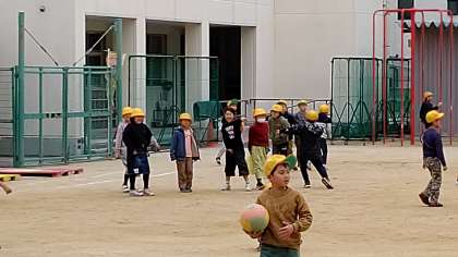 今日は、運動場で1年生から3年生までの児童が遊んでいます。風は強いですが、暖かい空気です。