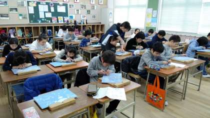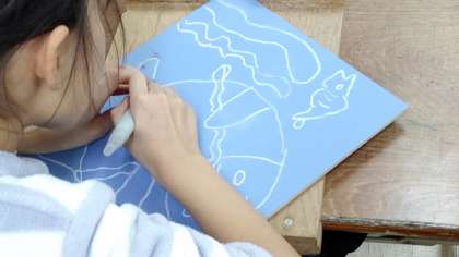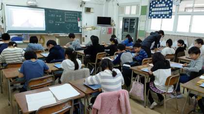 5時間目、4年生が図工の学習をしていました。自分が考えた「想像上の魚」の版画を作っています。