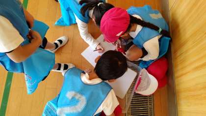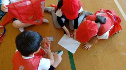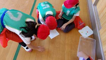 3時間目、2年生が講堂で体育の学習をしていました。グループごとに作戦を考えていました。