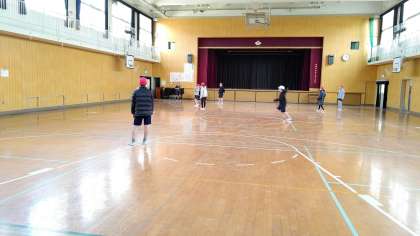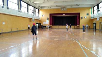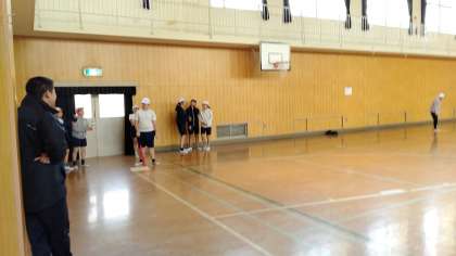 4時間目、6年生が講堂で体育の学習をしていました。「ソフトボール」をしています。
