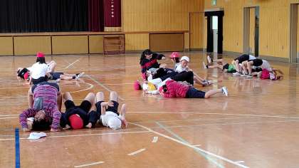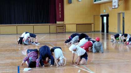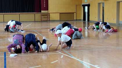 5時間目、5年生が講堂で体育の学習をしていました。「友だちのブリッジの下をくぐる」準備運動をしています。