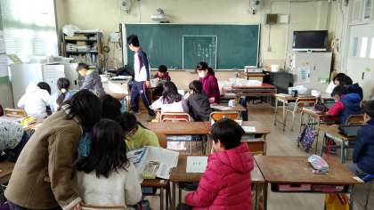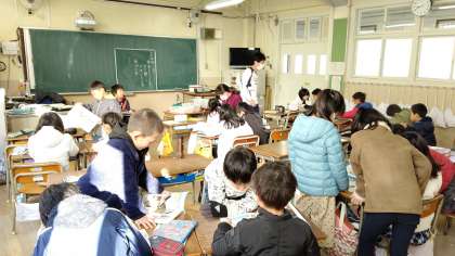 3年生が、朝の学級活動で、昨日の続き「昔の道具」をまとめていました。