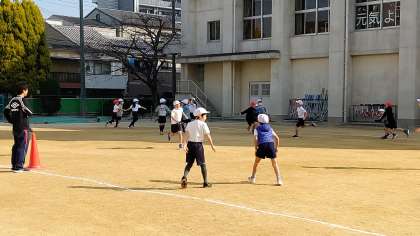 2時間目、3年生が運動場で体育の学習をしていました。「鬼ごっこ」をして、準備運動をしています。