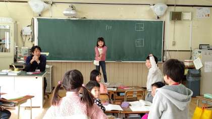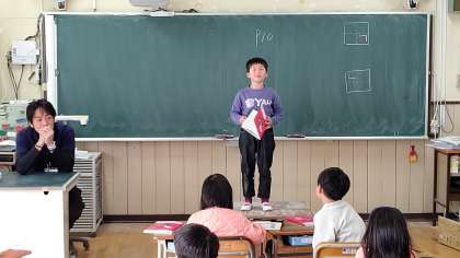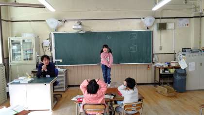 2時間目、1年生が国語の学習をしていました。「新しいじゃんけん」を考えて、みんなとじゃんけんをしています。