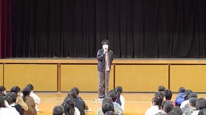 今日は、講堂で全校朝会がありました。校長先生のお話のあと、森田先生からお話がありました。