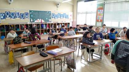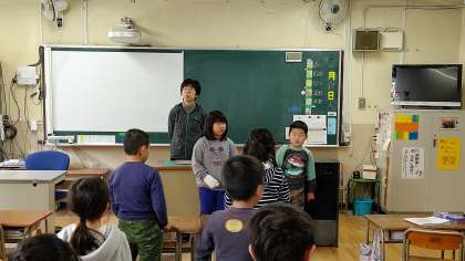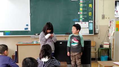 日直さんが、前に出て朝の会をしていました。お話をみんなの前でしています。