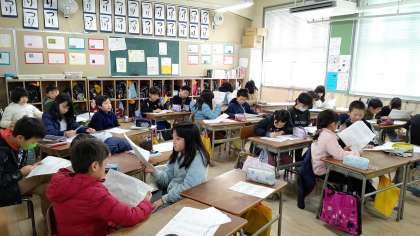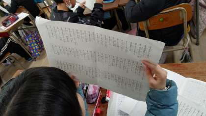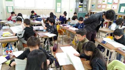 1時間目、3年生が国語の学習をしていました。漢字プリントを読む練習をしています。