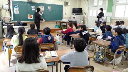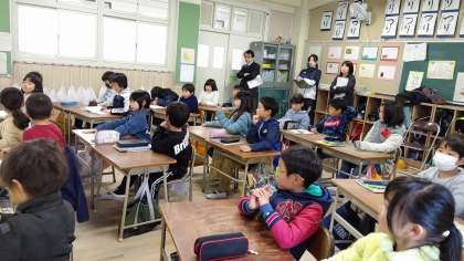 2時間目、3年生が社会科の学習をしていました。「今と昔の暖房器具」について学習しています。今日は、教育センターから石橋先生が来られて、河村先生の授業を参観しています。
