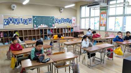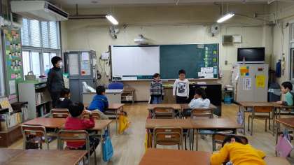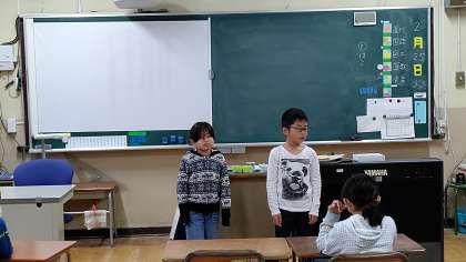 2年生が朝の会をしていました。日直さんが、前に出てお話をしています。