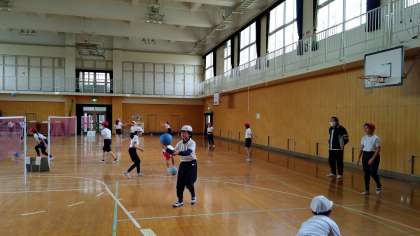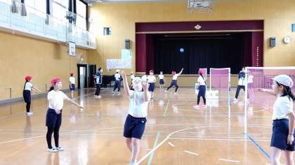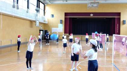 4年生が講堂で体育の学習をしていました。「キャッチバレーボール」をしています。