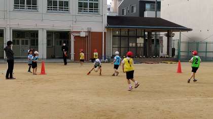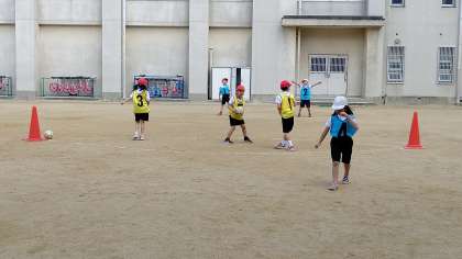5時間目、1年生が運動場で体育の学習をしていました。「たまごわりサッカー」をしています。