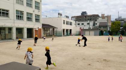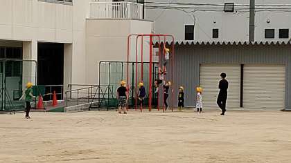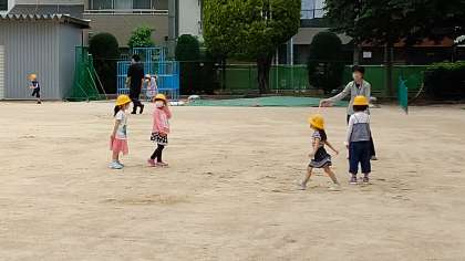 初めて、運動場で遊んでいます。楽しそうにみんな仲良く活動しています。