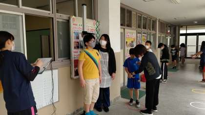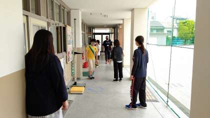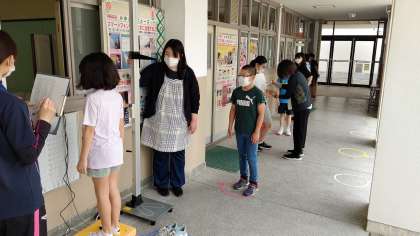 保健室前の廊下で、密にならないように並んで、身体測定をしていました。