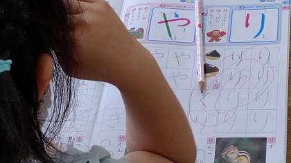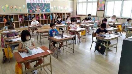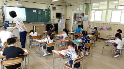 1時間目、1年生が国語の学習をしています。ひらがな「ま」「よ」を学習しています。
