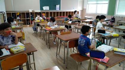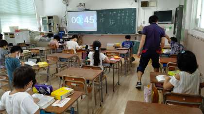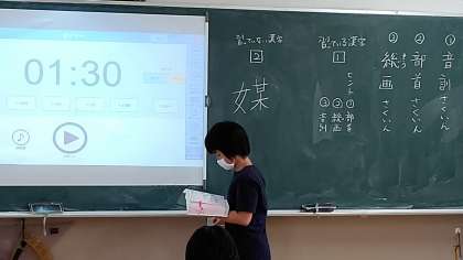2時間目、4年生が国語の学習をしています。出題された漢字を漢字辞典で見つける競争をしていました。