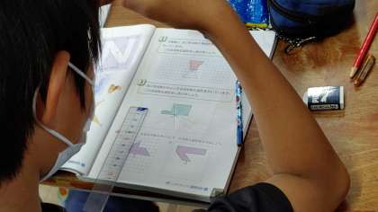 1時間目、6年生が算数の学習をしています。「点対称な図形の作図」をしています。