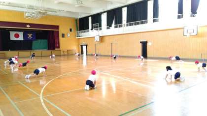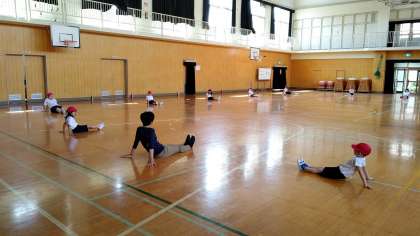 2時間目、1年生が講堂で体育の学習をしています。