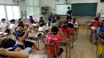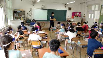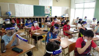 4時間目、5年生が英語を学習していました。大きな声を出すので、フェイスシィールドを着用して授業を受けています。