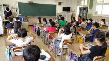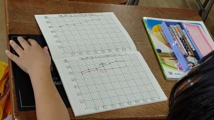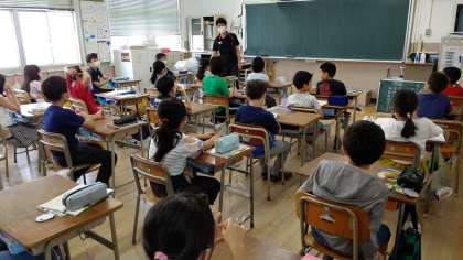 2時間目、4年生が理科の学習をしています。はじめに、次の時間にする国語テストの準備をしたあと、理科の学習をしています。「晴れの日と曇りの日の気温の変化」について学習しています。
