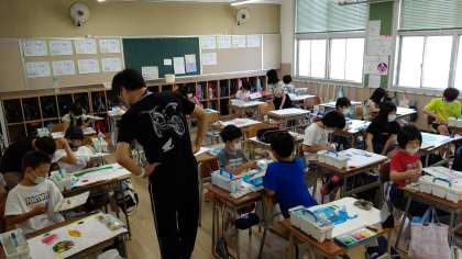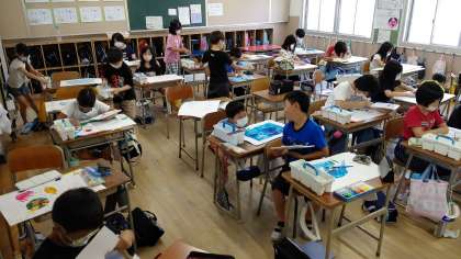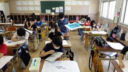 2時間目、4年生が図画工作の学習をしています。絵を描いています。