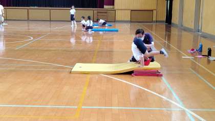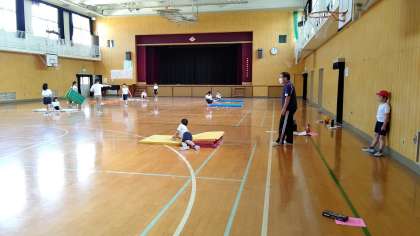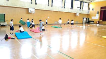 4時間目、3年生が講堂で体育の学習をしています。「前回り、後ろ回り」の練習をしています。