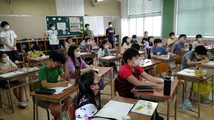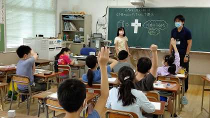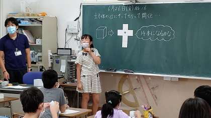 6時間目、5年生が算数の学習をしています。「立方体の展開図」を学習しています。多くの先生方が、参観されていました。