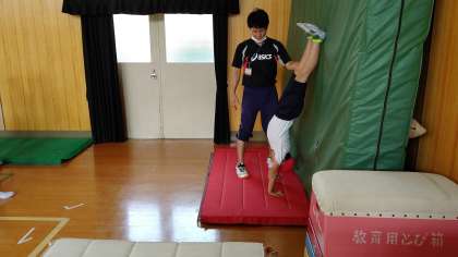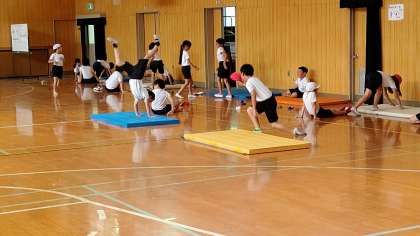 6時間目、4年生が講堂で体育の学習をしています。「倒立」を練習しています。