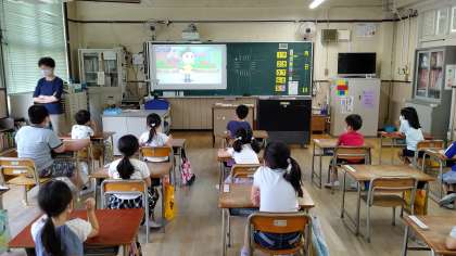 1時間目、1年生が交差点の渡りかたを教えてもらっています。