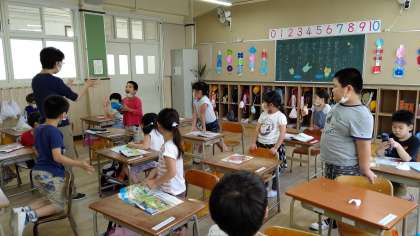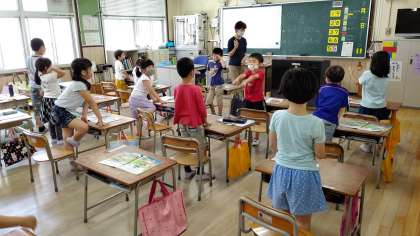5時間目、1年生が音楽の学習をしています。なまえをよんで、つなげています。