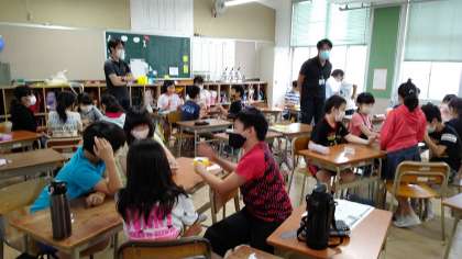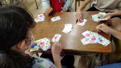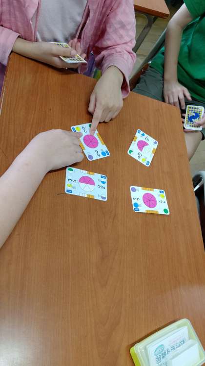 分数のカードを使って、トランプゲームをしながら、分数を学習しています。