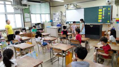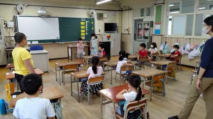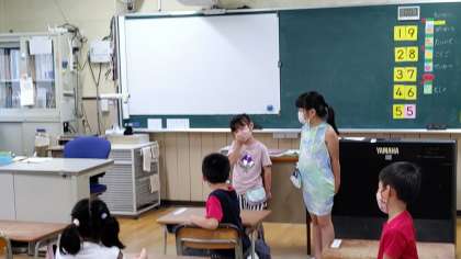 1時間目、1年生が学級活動をしています。係りの児童が前に出て、お話をしています。そのあと、木曜日のみんなあそびの内容を話し合っています。