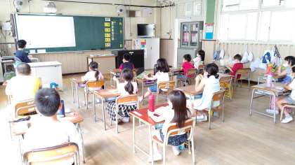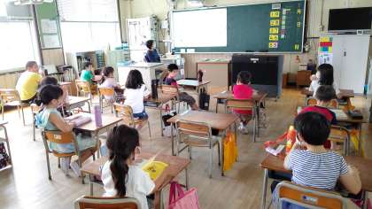5時間目、1年生が読書をしています。山本先生が読み聞かせをしています。