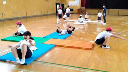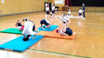 4時間目、6年生が講堂で体育の学習をしています。グループに分かれて「前廻り」を組み合わせた演技を練習しています。