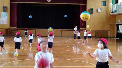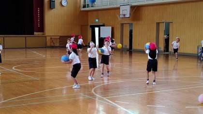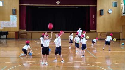 5時間目、2年生が講堂で体育の学習をしています。「ボールを上に投げて、落ちてくるボールをキャッチする間に何回手をたたくことができるか」チャレンジしています。