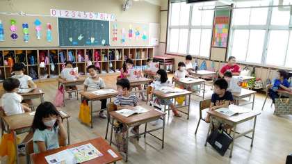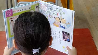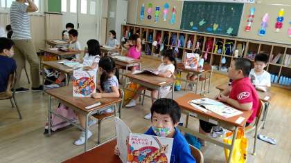 5時間目、1年生が音楽の学習をしています。「たなばたさま」をみんなで歌っています。