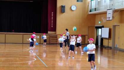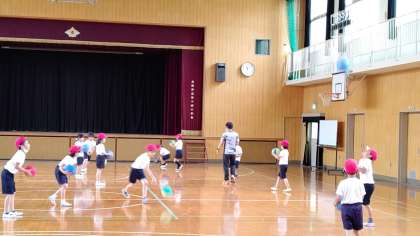 3時間目、2年生が講堂で体育の学習をしています。ボール運動をしています。